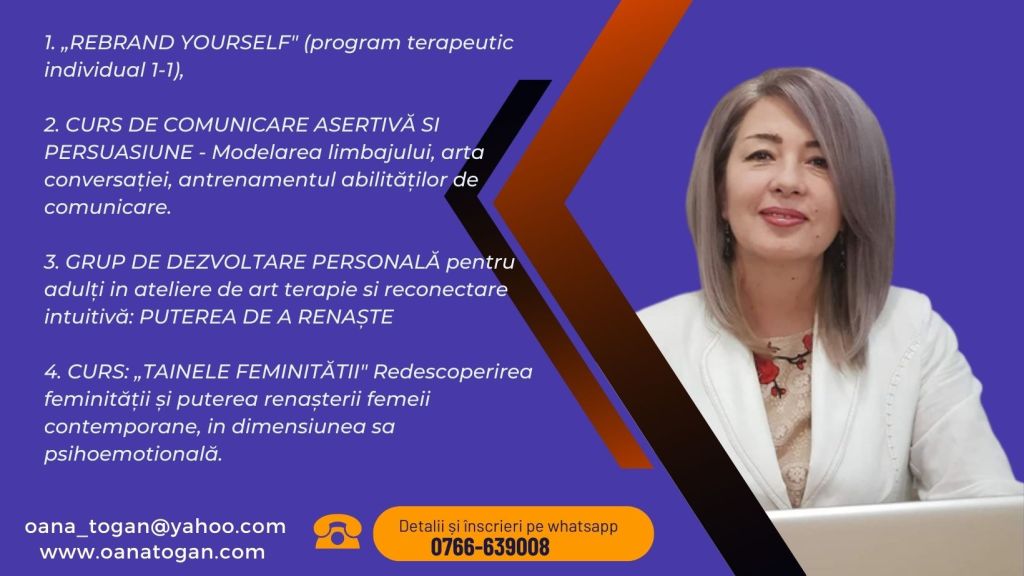 Dacă ești interesat/interesată despre ceea ce ofer sau să afli mai multe despre aceste cursuri și întâlniri, te invit sa te înscrii pe wp la acest număr de telefon 0766639008 să discutăm mai în detaliu, pe nevoile tale, sau poti să spui ,,DA” in comentarii și voi fi mai mult decât bucuroasă să-ți ofer mai multe informații și să răspund la întrebările pe care le ai în privat.