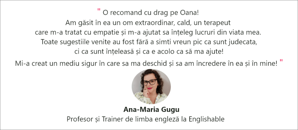 Experiența în lucrul cu oamenii, după cea din sfera medicală, a venit inițial în lucrul cu clienți 1-1 ca și life & bussines coach și master NLP, apoi în cabinet, sute de ore de terapie, workshop-uri, seminarii și tabără a cărei prima ediție a fost organizată în anul 2021, sunt ceea ce mă recomanda alături de feedback-ul clienților si clientelor mele, desigur. Vezi aici: https://www.facebook.com/psihologOanaTogan/reviews