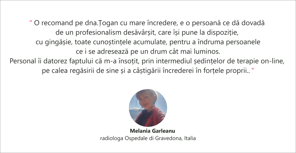 Numele meu este Oana Țogan, sunt psiholog clinician autonom, psihoterapeut integrativ, confidențial coach, master NLP, formator și trainer.